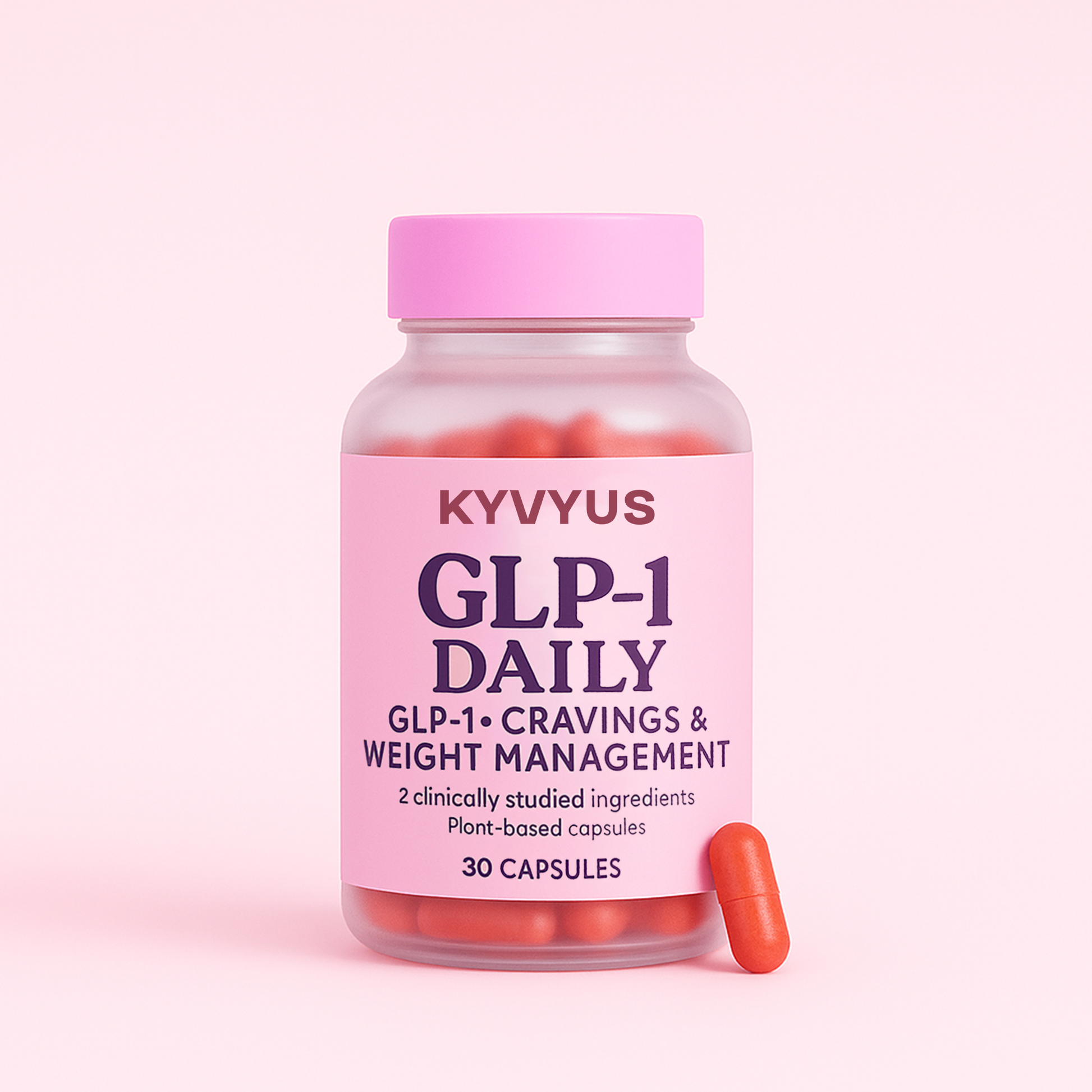 Kyvyus GLP-1 Daily™ supports your body’s GLP-1 production, reduces hunger, promotes healthy insulin function and supports healthy weight management with 3 clinically-tested ingredients.* GLP-1 Daily™ does not contain synthetic GLP-1 and is not a GLP-1 agonist drug.