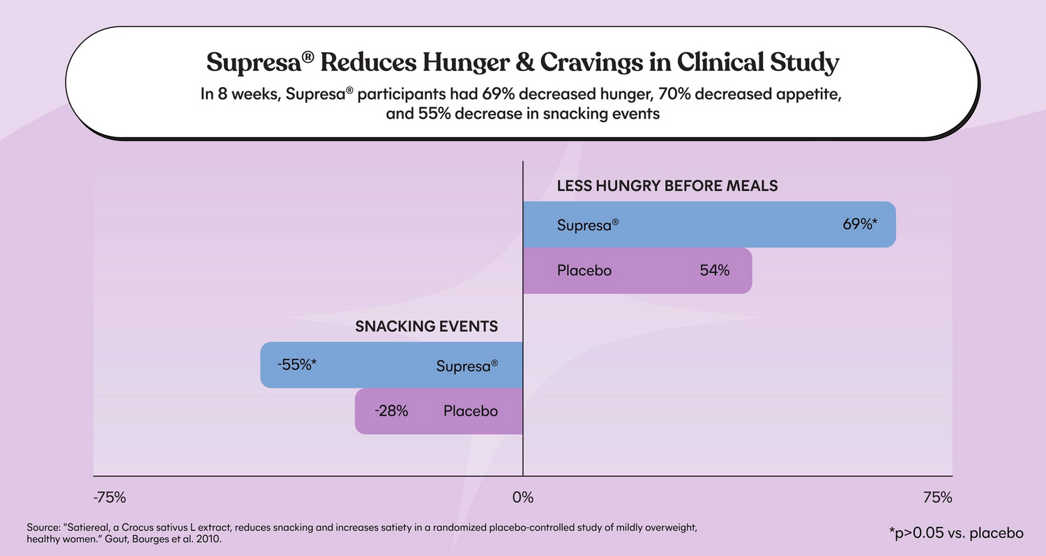 Reduce snacking with patented and clinically-studied Supresa® saffron extract. Within 8 weeks, 69% of Supresa® participants reported a decrease in hunger.*