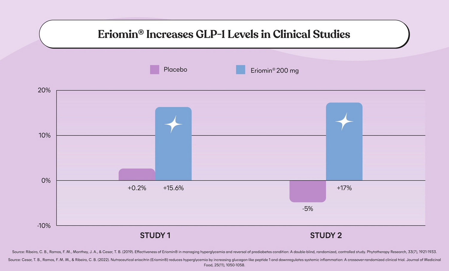 Eriomin®lemon fruit extract is a patented and clinically-studied ingredient with ground-breaking results. Derived from lemons using a proprietary extraction process, Eriomin®is standardized to contain high levels of eriocitrin, a flavonoid that has shown promising effects on GLP-1 and glucose metabolism. At a clinically-studied dose, Eriomin is shown to increase GLP-1 levels, support insulin function and promote healthy blood glucose levels in the normal range. Eriomin®is standardized to 70% eriocitrin, a potent antioxidant found in lemons.